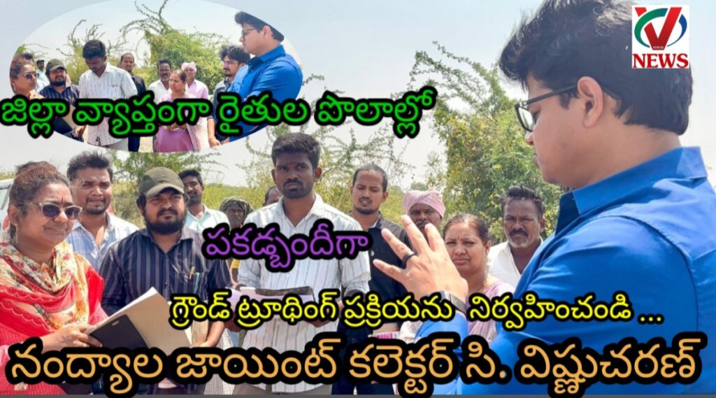 V POWER NEWS .. : నంద్యాల జిల్లా వ్యాప్తంగా రైతుల పొలాల్లో జరుగుతున్న గ్రౌండ్ ట్రూథింగ్ ప్రక్రియను పకడ్బందీగా నిర్వహించాలని జాయింట్ కలెక్టర్ సి. విష్ణుచరణ్ రెవెన్యూ, సర్వే శాఖల అధికారులను ఆదేశించారు. బుధవారం బనగానపల్లె మండలం, నందివర్గం గ్రామంలో జరుగుతున్న రీ సర్వే పనుల గ్రౌండ్ ట్రూథింగ్ ప్రక్రియను జాయింట్ కలెక్టర్ ఆకస్మికంగా తనిఖీ చేశారు. ఈ సందర్భంగా జాయింట్ కలెక్టర్ సి. విష్ణుచరణ్ మాట్లాడుతూ మండలాల్లో జరుగుతున్న రీ సర్వే పనుల గ్రౌండ్ ట్రూథింగ్ ప్రక్రియను పకడ్బందీగా నిర్వహించేందుకు ప్రత్యేక శ్రధ్ధ తీసుకోవాలని రెవెన్యూ, సర్వే శాఖల అధికారులను ఆదేశించారు. ప్రతిరోజు 25 ఎకరాలకు మించకుండా రీసర్వే పనుల గ్రౌండ్ ట్రూథింగ్ ప్రక్రియను పరిశీలిస్తూ విస్తీర్ణ కొలతలు అడిగి తెలుసుకుంటూ మార్పులు లేకుండా రికార్డుల్లో వున్న మేరకు సర్వే పనులు చేపట్టాలన్నారు. చేపట్టిన సర్వే పనులు నిర్దేశిత గడువులోపు పూర్తి చేసేందుకు చర్యలు తీసుకోవాలన్నారు. గ్రామ సరిహద్దు స్థిరీకరణ, స్టోన్ ప్లాంటేషన్ తదితర పనులు కూడా పూర్తి చేసేందుకు చర్యలు తీసుకోవాలన్నారు. పెండింగ్లో ఉన్న మ్యుటేషన్ కరెక్షన్స్, మ్యుటేషన్ ట్రాన్స్యాక్షన్స్ సంబంధిత దరఖాస్తులను కూడా దరఖాస్తులను కూడా త్వరితగతిన పూర్తి చేయాలని జాయింట్ కలెక్టర్ ఆదేశించారు. తాసిల్దార్, సర్వే అధికారులు, గ్రామ రైతులు , సిబ్బంది తదితరులు పాల్గొన్నారు.