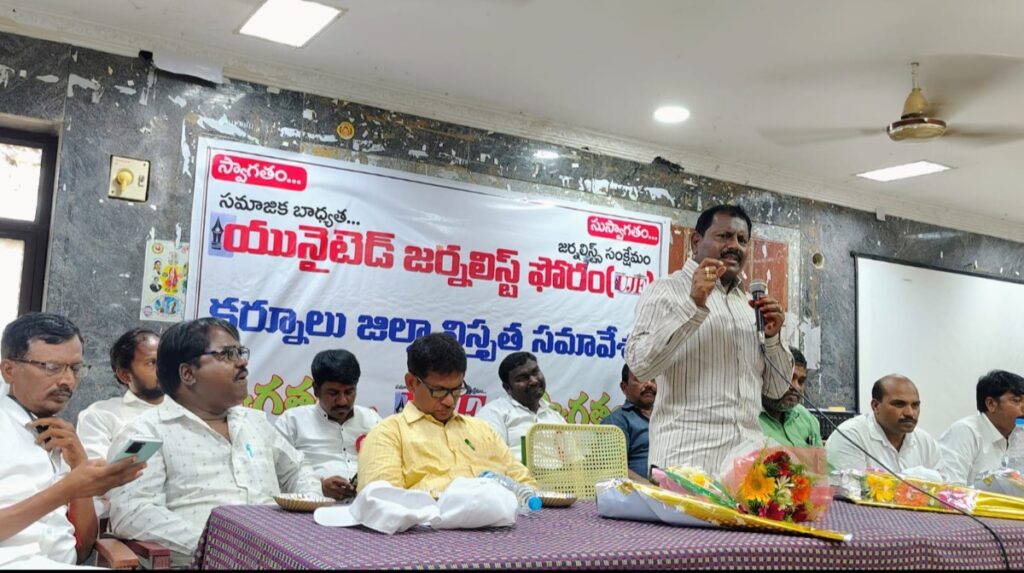 యునైటెడ్ జర్నలిస్ట్ ఫోరం ఎలక్ట్రానిక్ విభాగం నూతన జిల్లా కమిటీ . అధ్యక్షులు : విజయ్ కుమార్, కార్యదర్శి : మెట్రో మధు, ఉపాధ్యక్షులు : జి.వి.ప్రవీణ్ కుమార్, ఉపాధ్యక్షులు : రవిశంకర్ గౌడ్. యునైటెడ్ జర్నలిస్ట్ ఫోరం ప్రింట్ విభాగం నూతన జిల్లా కమిటీ . జిల్లా గౌరవ అధ్యక్షులు : యూసఫ్ ఖాన్, అధ్యక్షులు : విద్యాసాగర్, కార్యదర్శి : చంద్రమోహన్, కోశాధికారి : సంధ్య ప్రసాద్, ఉపాధ్యక్షులు : పరమేష్, సహాయ కార్యదర్షులు :ఎం.సీ.వెంకటేష్,లక్ష్మణ్, ఈసీ మెంబర్స్ : వరప్రసాద్,వడ్డేమాన్ విజయ్ కుమార్,వారణాసి ప్రసాద్. V POWER NEWS : మీడియా స్వేచ్ఛను కాపాడడంలో భారతదేశం ప్రపంచంలో అధమస్థానంలో ఉందని ఇది అత్యంత దయనీయమైన పరిస్థితి అని హైకోర్ట్ సీనియర్ అడ్వకేట్ వై.జయరాజు అన్నారు.ఆదివారం స్థానిక జిల్లా పరిషత్తు ప్రాంగణంలోని, ఎంపీపీ సమావేశ మందిరంలో యునైటెడ్ జర్నలిస్టు ఫోరం (యుజెఎఫ్) జిల్లావిస్తృత సమావేశం అత్యంత ఉత్సాహ వాతావరణంలో సాగింది. ఈ సందర్బంగా జర్నలిస్టులు కిసాన్ ఘాట్ నుంచి రాజవిహార్ సెంటర్ మీదుగా జిల్లా పరిషత్ వరకు బైక్ ర్యాలీని నిర్వహించారు. అనంతరం ఎంపీపీ హాలులో జర్నలిస్ట్ లకు రక్తం గ్రూప్ పరీక్షలు,హెచ్ పరీక్షలు జరిపారు. తదనంతరం జిల్లా విస్తృత సమావేశం యునైటెడ్ జర్నలిస్ట్ ఫోరం (యుజెఎఫ్) నగర కార్యదర్శి జి.మునిస్వామి అధ్యక్షతన నిర్వహించారు. సమావేశానికి హైకోర్ట్ సీనియర్ అడ్వకేట్ వై.జయరాజు, జెవివి జిల్లా అధ్యక్ష,ప్రధాన కార్యదర్శులు బీ.డీ.సుధీర్ రాజు,డాక్టర్ బడేసాహెబ్, సీనియర్ జర్నలిస్టు చంద్రయ్య,అడ్వకేట్ లక్ష్మీనారాయణ యాదవ్,యుజెఎఫ్ వ్యవస్థాపక అధ్యక్ష,కార్యదర్శులు సత్యనారాయణ, చిన్న రామాంజ నేయులు హాజరై మాట్లాడారు. దేశంలో ప్రజలకు ప్రభుత్వాలకు మధ్య వారిదిగా మీడియా పనిచేస్తుందన్నారు. అలాంటి మీడియాను ముందుకు నడిపించే ఇంధనంగా జర్నలిస్టులు పనిచేస్తున్నారన్నారు. రోజురోజుకు మీడియా శక్తి విస్తరిస్తోందన్నారు. కాగా మీడియా పట్ల జరుగుతున్న దాడులు ఆందోళనను కలిగిస్తున్నాయన్నారు. ప్రపంచంలో మీడియా స్వేచ్ఛ అత్యంత అదమస్థానంలో ఉన్న దేశంగా భారత్ నమోదయిందన్నారు. అందులో భారత్ 161వ స్థానంలో నిలిచిందని అన్నారు. దేశంలో కార్పొరేట్ ల చేతుల్లో మీడియాకు ఉందన్నారు.దేశంలో సాగుతున్న మూడ విశ్వాసాలను ప్రశ్నించే మీడియా సంస్థలపై,మతతత్వ శక్తులు దాడులకు తెగబడుతున్నాయి అన్నారు.రాజ్యాంగ పీఠికలో స్వేచ్ఛ సమాజం లౌకిక భావనలను కాపాడాల్సిన పాలకులు వాటిని నిర్వీర్యం చేసే దిశగా కృషి చేస్తున్నాయని చెప్పారు. తెరచాటున మతతత్వయజండాను అమలు చేసే కుట్రలను బయటికి జర్నలిస్టులు తీయాలని,దాని ప్రమాదానాలను ఎండగట్టాలన్నారు. సమాజ సంపదపై అందరికీ సమానహక్కు ఉన్నప్పటికీ అది కేవలం 10శాతం మందిక
